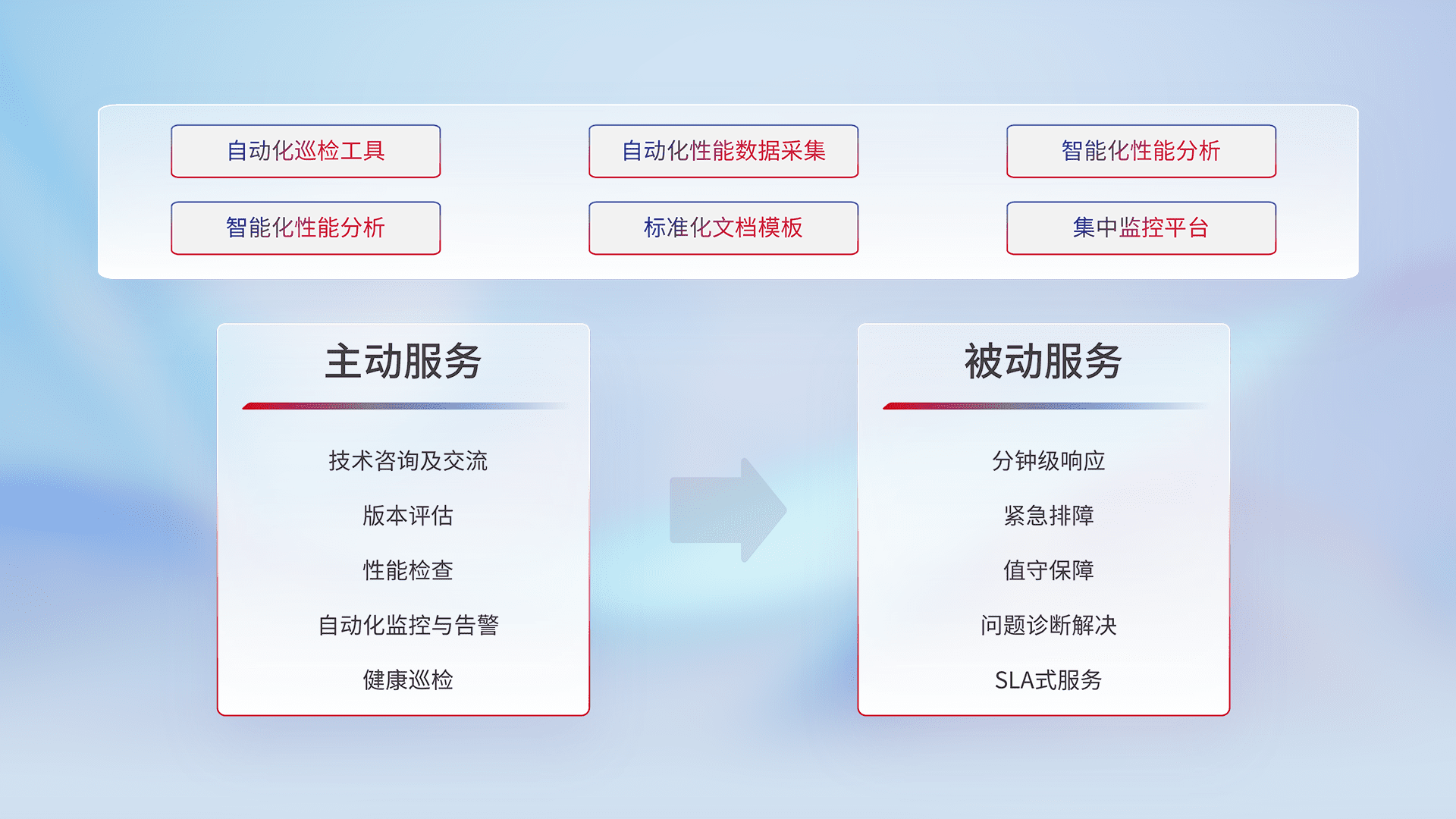 智能化工具和标准化文档,,,保障服务质量,,,,提供主动服务(包含技术咨询、、、、版本评估、、性能检查、、、、自动化监控与告警、、、健康巡检)和被动服务包含(分钟级响应、、、紧急排障、、、值守保障、、、问题诊断解决、、、、SLA服务)。。